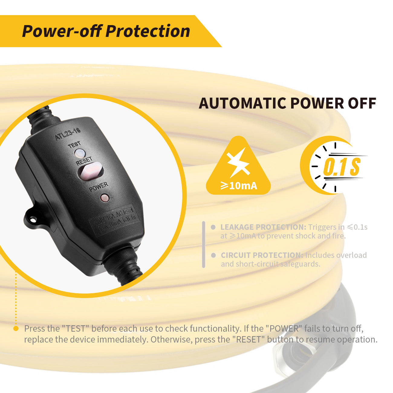 - ADVANCED PROTECTION - High-sensitivity 10mA leakage circuit breaker automatically cuts off power within 0.1 seconds when detecting current leaks, preventing your home and workshop from electric shocks and fire hazards.